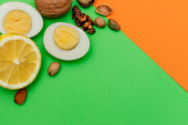 Płaska dieta ketogenna. wokalo, jajka, cytryna, kiwi i orzechy na zielonym i żółtym tle. Pojęcie zdrowej żywności, widok z góry.Kopiuj miejsce na makietę