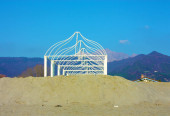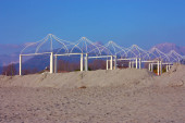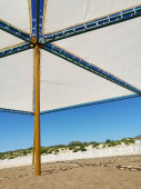struktury opustoszałych parasoli i namiotów niewykorzystanych kąpielisk bez kwarantanny na plaży nad morzem w Toskanii
