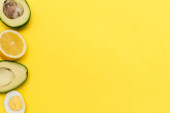 Płaska dieta ketogenna. wokalistka, jajko, cytryna i orzechy na zielonym i pomarańczowym tle. Pojęcie zdrowej żywności, widok z góry.Kopiuj miejsce na makietę