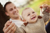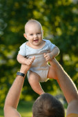 małe dziecko w ramionach ojca przeciwko słonecznemu niebu, dzień ojca, ojcostwo, szczęśliwe dziecko