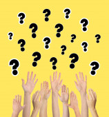 Kolaż osób podnoszących ręce i znaki zapytania na białym tle, zbliżenie