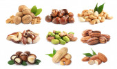Zestaw różnych suchych owoców i orzechów na białym tle. Projekt banera