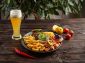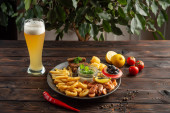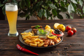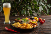 szklanka piankowego piwa i talerz z przekąskami: krewetki, pierścienie kalmarów, frytki, grzanki żytnie, oliwki na drewnianym tle