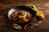 Zdjęcie "szklanka piankowego piwa i talerz z przekąskami: krewetki, pierścienie kalmarów, frytki, grzanki żytnie, oliwki na drewnianym tle" może być wykorzystywane do celów osobistych i komercyjnych zgodnie z warunkami zakupionej licencji Royalty-free. Obraz jest dostępny do pobrania w jakości wysokiej rozdzielczości do 5760x3840.