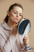 nowoczesna kobieta w czarnej bieliźnie ciała i czerwony szlafrok w nowoczesnym domu w słoneczny dzień wprowadzenie czarny hydrożel masaż ust i patrząc w lustro.