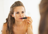 młoda kobieta w czarnej bieliźnie ciała i czerwony szlafrok z lustrem stosowania czarnej hydrożel maska wargi w nowoczesnym domu w słoneczny dzień.