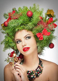 Świąteczna kobieta. Piękny Nowy Rok i Choinka Holiday Fryzura i makijaż.