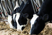 Zautomatyzowana farma mleka krowiego. Krowy na padoku z tagami na uszach jedzą siano i odpoczywają z bliska.