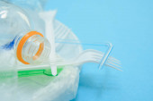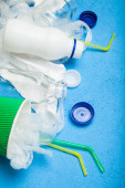 Sprzęt antywirusowy, maska n95, dezynfekcja rąk, chusteczki dezynfekujące, rękawiczki. Brzeg górnego rogu widoku na niebieskim tle z miejscem do kopiowania.