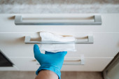 Zdjęcie "Coronavirus COVID-19 Zapobieganie wycieraniu klamki antybakteryjnym rozpylaczem do dezynfekcji w celu zabicia wirusa korony na dotyku powierzchni lub dotykania rękojeści publicznej łazienki tkanką." może być wykorzystywane do celów osobistych i komercyjnych zgodnie z warunkami zakupionej licencji Royalty-free. Obraz jest dostępny do pobrania w jakości wysokiej rozdzielczości do 5760x3840.