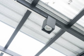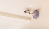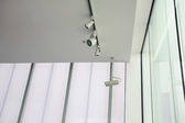 Kamera CCTV na elewacji nowoczesnego biurowca na ulicy, ochrona w roku. Tajne ujęcie tego, co się dzieje. nowoczesne technologie i wyposażenie.