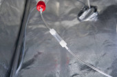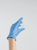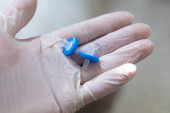 sterylizacja rąk niebieskimi rękawiczkami ochronnymi.