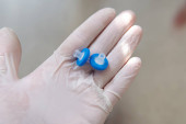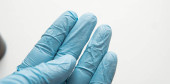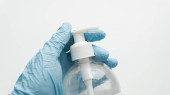 sterylizacja rąk niebieskimi rękawiczkami ochronnymi.