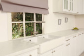 Ceramiczne zlewozmywak i nowoczesny kran w stylowej kuchni wnętrza