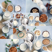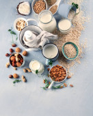 Zdjęcie "Różne wegańskie mleko roślinne i składniki. Mleczny napój zastępczy bez mleka. Zdrowa wegańska i wegetariańska koncepcja diety. Widok z góry " może być wykorzystywane do celów osobistych i komercyjnych zgodnie z warunkami zakupionej licencji Royalty-free. Obraz jest dostępny do pobrania w jakości wysokiej rozdzielczości do 5760x3840.