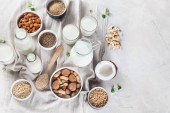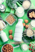 Różne wegańskie mleko roślinne i składniki. Mleczny napój zastępczy bez mleka. Zdrowa wegańska i wegetariańska koncepcja diety. Widok z góry