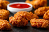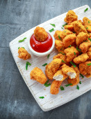 Chrupiące bryłki krewetek z ketchupem i majonezem na rustykalnej tablicy kamiennej.