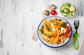 Wegetariańska sałatka z liści, pomidorów, pieczarek marynowanych. Koncepcja zdrowej żywności. Widok z góry, przestrzeń kopiowania.