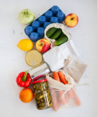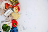 Zestaw różnych produktów do dawstwa. Konserwy, ryż, jajka, owoce i warzywa na białym tle, widok z góry, przestrzeń do kopiowania