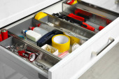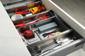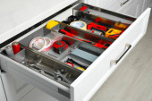 Zestaw instrumentów w otwartej szufladzie biurka w pomieszczeniu