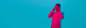Zdjęcie "Dziewczyna z dredami, warkoczykami tańczącymi, jasnym neonowym zdjęciem na okładce albumu muzycznego, tańcem, imprezą, zaproszeniem. Jasna dziewczyna, czerwono-niebieska inwersja kolorów. Modelka tańcząca w okularach, klub nocny" może być wykorzystywane do celów osobistych i komercyjnych zgodnie z warunkami zakupionej licencji Royalty-free. Obraz jest dostępny do pobrania w jakości wysokiej rozdzielczości do 5760x3840.