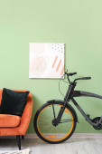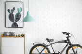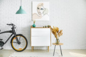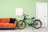 Wnętrze nowoczesnego salonu z wygodną sofą i rowerem