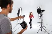 Selektywne skupienie fotografa patrzącego na wyświetlacz aparatu cyfrowego w pobliżu eleganckiego modelu i reflektora w studiu fotograficznym