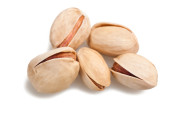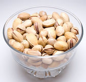 Orzeszki pistacjowe na białym talerzu. Odizolowane tło. Widok z góry.