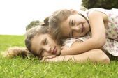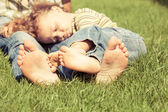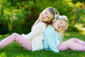 dwie małe dziewczynki szczęśliwy grając w parku w czasie dnia