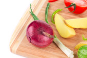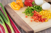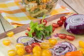 Składniki do spiralnej sałatki z makaronem cukinii - cukinia, pomidory wiśniowe, papryka, cebula.