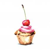 Ciasto akwarelowe z wiśni i czekolady izolowane na białym tle. Ręcznie rysowane ilustracje