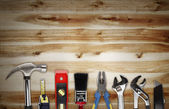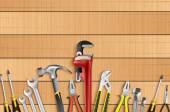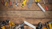 Zestaw narzędzi do naprawy dłoni na drewnianym tle z przestrzenią do kopiowania. Zrób to sam (DIY) koncepcja. Widok góry. Układy płaskie