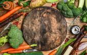 Pusta deska do krojenia i różne surowe warzywa do smacznego i zdrowego gotowania, widok z góry, miejsce na tekst, ramka. Wegańska lub wegetariańska koncepcja żywności