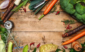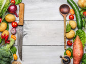 Różnorodność warzyw ekologicznych dla smaczne wegańskie lub wegetariańskie gotowanie na białym drewnianym tle, widok z góry, ramka. Koncepcja zdrowej lub dietetycznej żywności