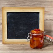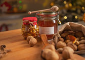 Młoda gospodyni wyświetlane słoik z miodem, orzechami i kciuki