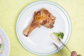 Cały pieczony kurczak pieczony ptak drobiowy z pieczonymi sałatkami ziemniaczanymi sałatka pomidorowa cytryna na drewnianej desce do krojenia białe tło