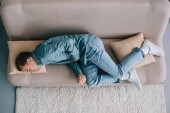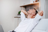 przycięty widok młodego człowieka chłodzącego i korzystającego ze smartfona na sofie podczas kwarantanny, koncepcja pozioma