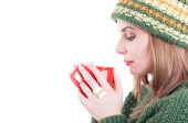 piękna młoda kobieta trzyma mały biały słoik z krem na białym tle