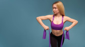 Skocz Sport. Kobieta w odzieży sportowej skacze na różowym tle z hantlami.