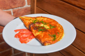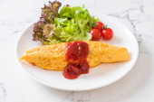 Śniadanie omlet jaj na białym tle marmuru. Smażony bekon i krojone pomidory. Ozdobiona pietruszką. Jajecznica z serem. Na białym talerzu. Zdjęcie do menu.