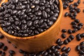 Stos surowej brazylijskiej czarnej fasoli w misce. Znany również jako "Feijao" nad drewnianym tablem