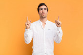 Zdjęcie "Człowiek czuje się zszokowany, otwarty i zdumiony, patrząc i wskazując w dół z niedowierzaniem i zaskoczeniem" może być wykorzystywane do celów osobistych i komercyjnych zgodnie z warunkami zakupionej licencji Royalty-free. Obraz jest dostępny do pobrania w jakości wysokiej rozdzielczości do 5760x3840.
