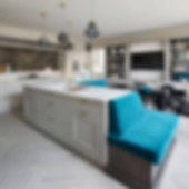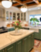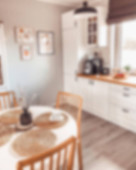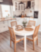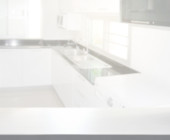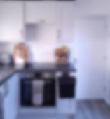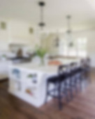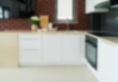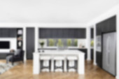 Zamazane wnętrze nowoczesnej białej kuchni z wyspą, granitowymi blatami, lodówką ze stali nierdzewnej, piekarnikiem i drewnianymi podłogami