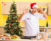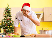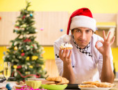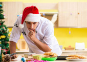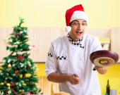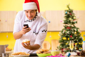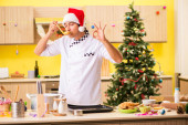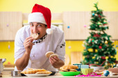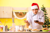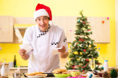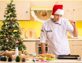 Młody kucharz mąż pracuje w kuchni, w Wigilię Bożego Narodzenia