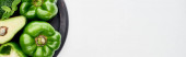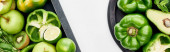 widok górny wegańskie burger z mikrozieleni i awokado na drewnianej desce do krojenia na białym tle, panoramiczne ujęcie