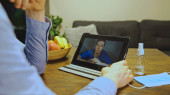 Nauczyciel patrzy, jak dziewczyna gra na pianinie. Edukacja domowa.