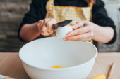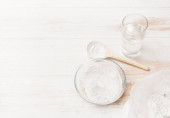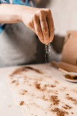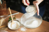 Kobieta piecze domowe ciasta w kuchni - wsypuje cukier do ciasta - wiejskie słodycze