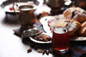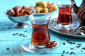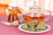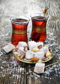 smaczne orientalnych słodyczy na tacy i szklanek herbaty, na szarym tle drewniane