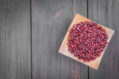 Szklany słoik z czerwoną fasolą na niebieskim tle.