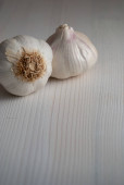 Kilka cebulek czosnku i goździków na drewnianym stole